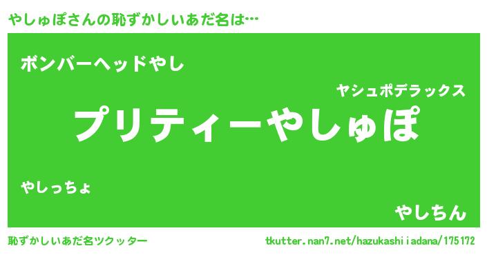 | 意味不明あだ名 | 『住所不定無職やしゅぽ(11歳)』 |