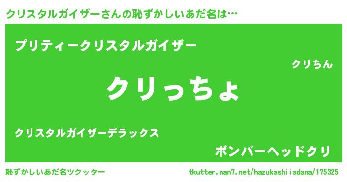 | 女子向けラノベタイトル風あだ名 | 『悪役クリスタルガイザーに転生したようですが、知った事ではありません』 |