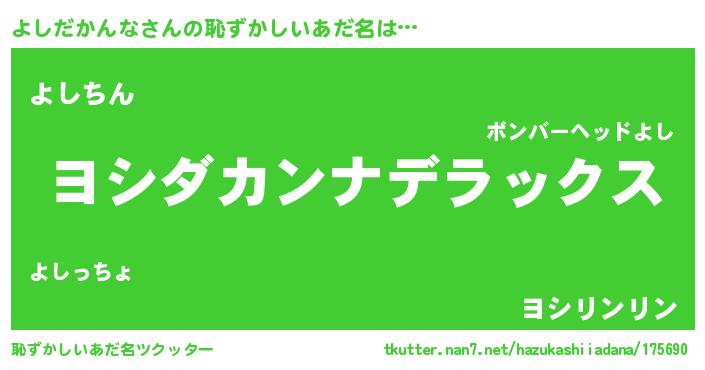 | ヒーロー風カッコイイあだ名 | 『最強戦士ヨシダカンナ』『銀牙騎士ヨシ』 |