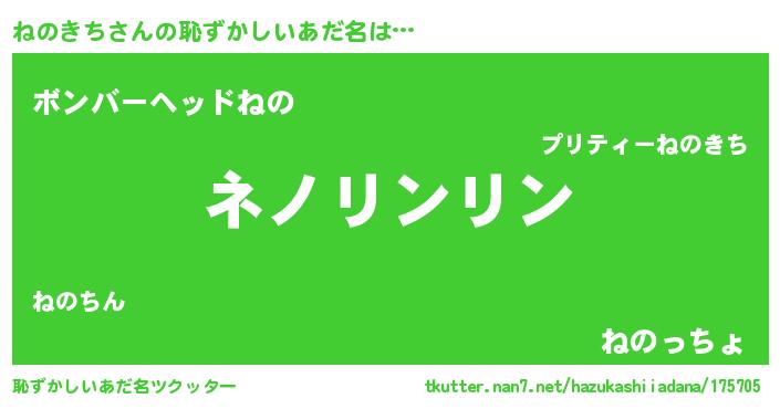| 男性向けラノベタイトル風あだ名 | 『ねのきちの嫁は女の子じゃないと思った?』 |