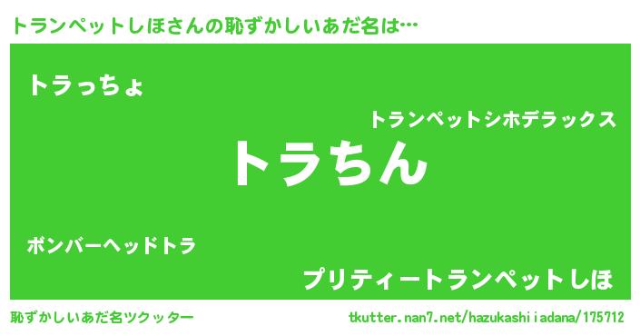 | 胡散臭い通販商品みたいなあだ名 | 『来世でも幸せになれる水素水…その名も「トランペットしほ」』 |