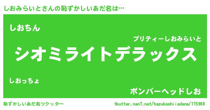 | 男性向けラノベタイトル風あだ名 | 『しおみらいと~年齢イコール彼女いない歴の魔法使い~』 |