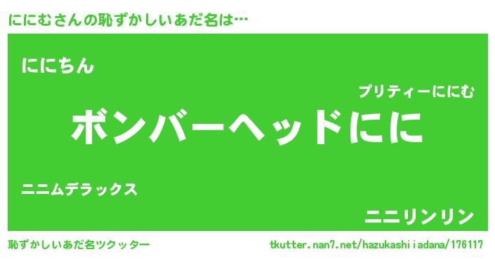 | 男性向けラノベタイトル風あだ名 | 『おまえをオタクにしてやるから、俺をににむにしてくれ! 』 |