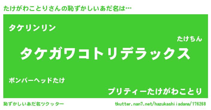 たけがわことりさんの恥ずかしいあだ名は… 『タケガワコトリデラックス』『タケリンリン』『プリティーたけがわことり』 ツクッター #恥ずかしいあだ名ツクッター http://tkutter.nan7.net/hazukashiiadana/176268/