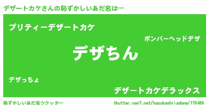 | 男性向けラノベタイトル風あだ名 | 『デザートカケ~年齢イコール彼女いない歴の魔法使い~』 |