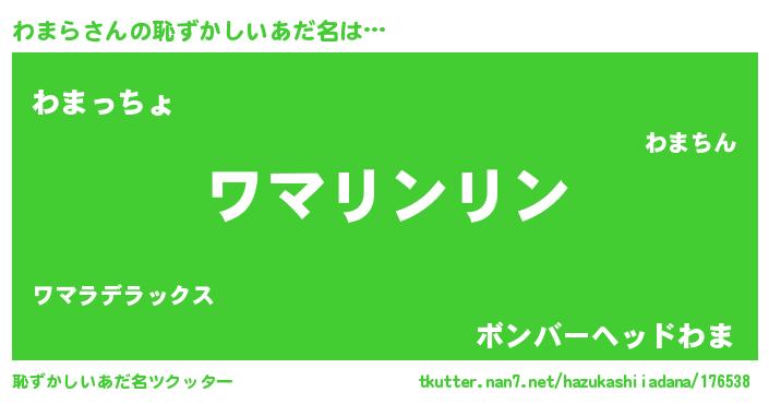 | 男性向けラノベタイトル風あだ名 | 『わまらの嫁は女の子じゃないと思った?』 |