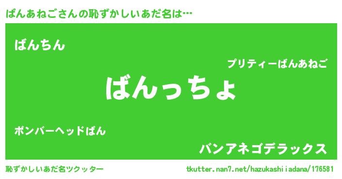 ばんあねごさんの恥ずかしいあだ名は… 『ばんっちょ』『ばんちん』『バンアネゴデラックス』 ツクッター #恥ずかしいあだ名ツクッター http://tkutter.nan7.net/hazukashiiadana/176581/
