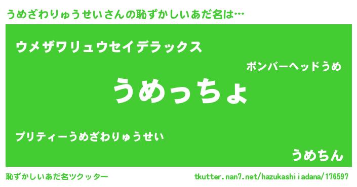 | 意味不明あだ名 | 『住所不定無職うめざわりゅうせい(41歳)』 |