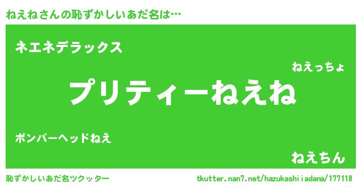 | ヒーロー風カッコイイあだ名 | 『スーパーネエネ』『究極戦士ネエネ』 |