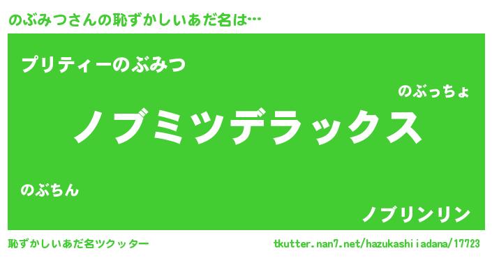 | 女子向けラノベタイトル風あだ名 | 『のぶみつなんてお断りですっ。』 |