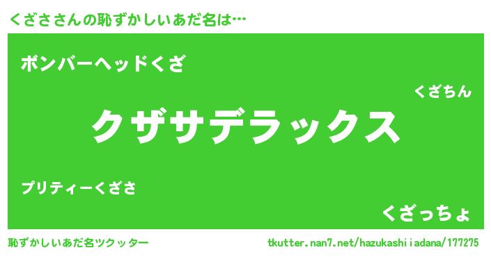 | 男性向けラノベタイトル風あだ名 | 『Re:くざさから始める異世界生活』 |