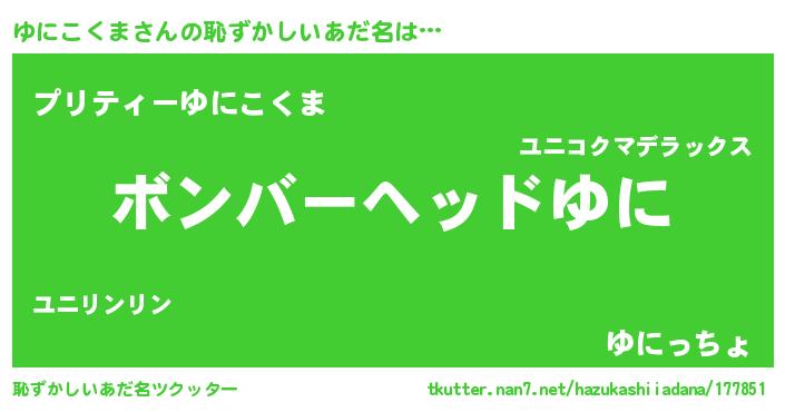 | 男性向けラノベタイトル風あだ名 | 『ゆにこくま~年齢イコール彼女いない歴の魔法使い~』 |