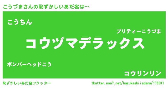 | 意味不明あだ名 | 『自称こうづま』『永久保存こうづま』 |