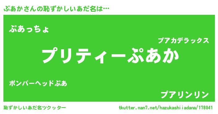 | 男性向けラノベタイトル風あだ名 | 『ぷあかの憂鬱』『はたらくぷあかさま!』 |