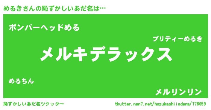 めるきさんの恥ずかしいあだ名は… 『メルキデラックス』『ボンバーヘッドめる』『メルリンリン』 ツクッター #恥ずかしいあだ名ツクッター http://tkutter.nan7.net/hazukashiiadana/178059/