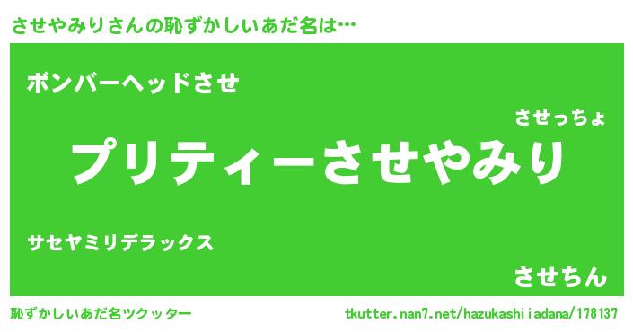 | ヘコむあだ名 | 『させにゅー』『させやみり(爆)』 |