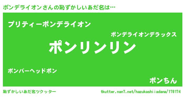 | 男性向けラノベタイトル風あだ名 | 『ポンデライオン~年齢イコール彼女いない歴の魔法使い~』 |