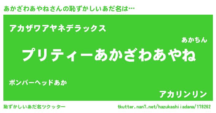 | 男性向けラノベタイトル風あだ名 | 『転生したらあかざわあやねだった件』 |