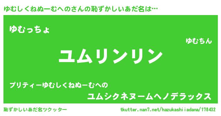 | 男性向けラノベタイトル風あだ名 | 『この素晴らしい世界にゆむしくねぬーむへのを!』 |