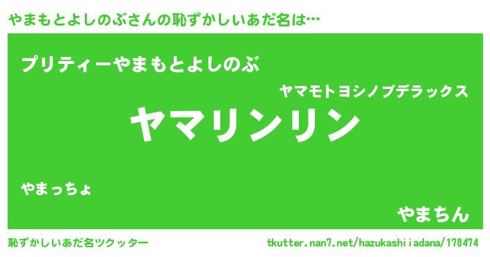 | 男性向けラノベタイトル風あだ名 | 『やまもとよしのぶ~年齢イコール彼女いない歴の魔法使い~』 |