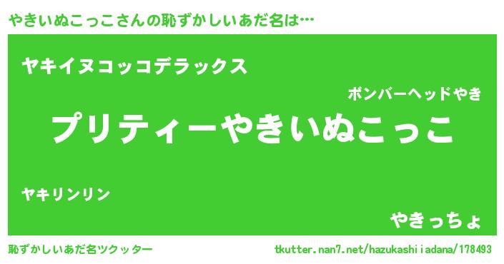やきいぬこっこさんの恥ずかしいあだ名は… 『プリティーやきいぬこっこ』『ヤキイヌコッコデラックス』『やきっちょ』 ツクッター #恥ずかしいあだ名ツクッター http://tkutter.nan7.net/hazukashiiadana/178493/