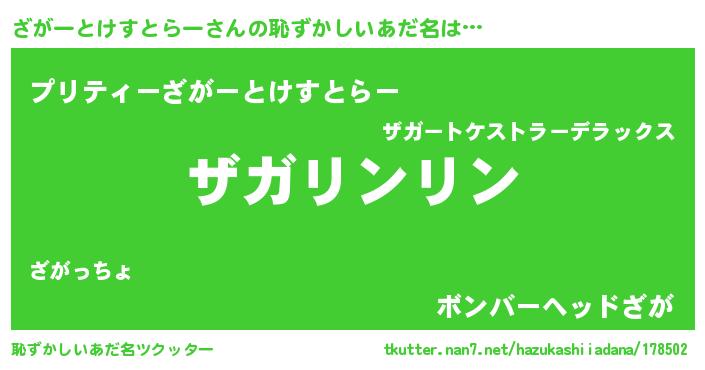| 意味不明あだ名 | 『住所不定無職ざがーとけすとらー(13歳)』 |