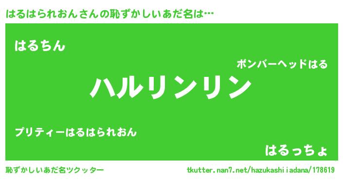 | 意味不明あだ名 | 『とにかく怪しいはるはられおん』 |