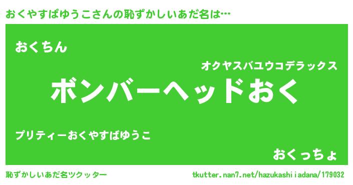 | 男性向けラノベタイトル風あだ名 | 『おくやすばゆうこ~年齢イコール彼女いない歴の魔法使い~』 |
