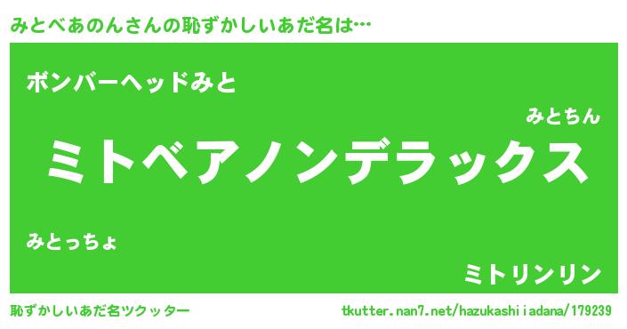 | 男性向けラノベタイトル風あだ名 | 『Re:みとべあのんから始める異世界生活』 |