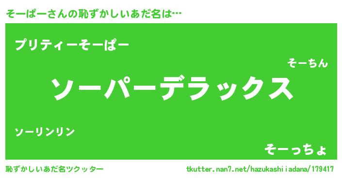 | 意味不明あだ名 | 『自称そーぱー』『ペロリンそーぱー』 |