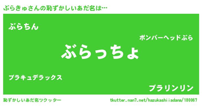 | 男性向けラノベタイトル風あだ名 | 『ぶらきゅに滅ぼされるだけの簡単なお仕事です』 |