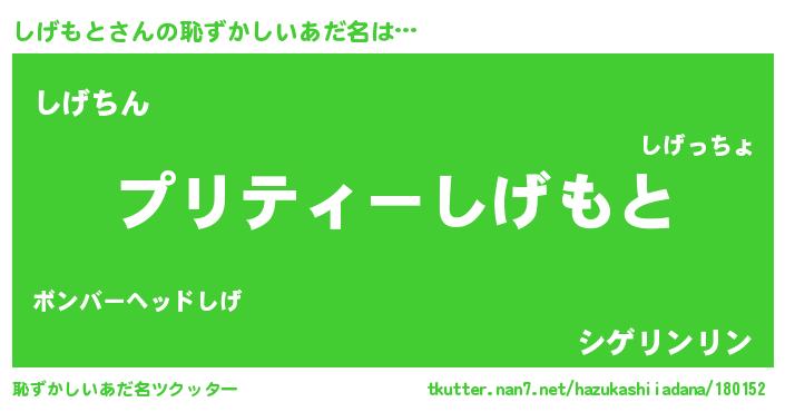 | 意味不明あだ名 | 『ペロリンしげもと』『永久保存しげもと』 |
