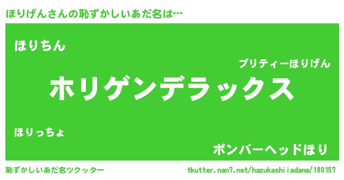 | 男性向けラノベタイトル風あだ名 | 『Re:ほりげんから始める異世界生活』 |