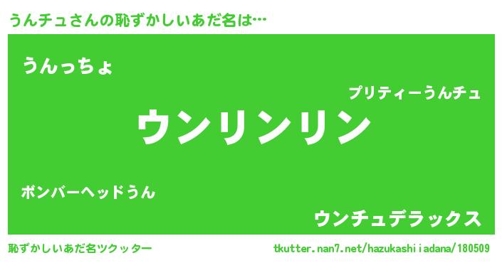 うんチュさんの恥ずかしいあだ名は… 『ウンリンリン』『うんっちょ』『ウンチュデラックス』 ツクッター #恥ずかしいあだ名ツクッター http://tkutter.nan7.net/hazukashiiadana/180509/