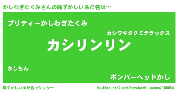 | 意味不明あだ名 | 『とにかく怪しいかしわぎたくみ』 |