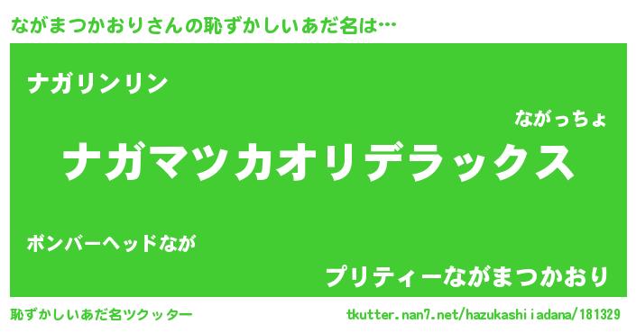 ながまつかおりさんの恥ずかしいあだ名は… 『ナガマツカオリデラックス』『ナガリンリン』『プリティーながまつかおり』 ツクッター #恥ずかしいあだ名ツクッター http://tkutter.nan7.net/hazukashiiadana/181329/