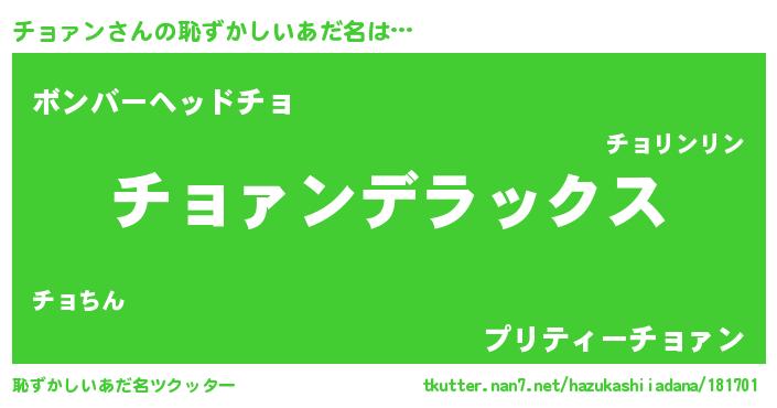 | 男性向けラノベタイトル風あだ名 | 『Re:チョァンから始める異世界生活』 |