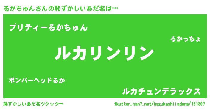 | 男性向けラノベタイトル風あだ名 | 『るかちゅんの嫁は女の子じゃないと思った?』 |