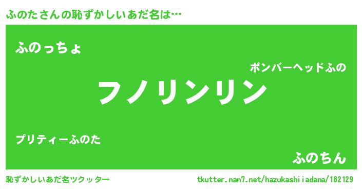 | 女子向けラノベタイトル風あだ名 | 『ふのた様がみてる』『ふのた伯爵の花嫁』 |