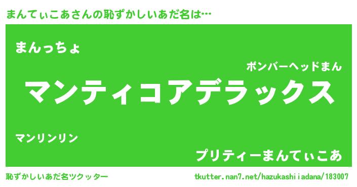 | 男性向けラノベタイトル風あだ名 | 『Re:まんてぃこあから始める異世界生活』 |