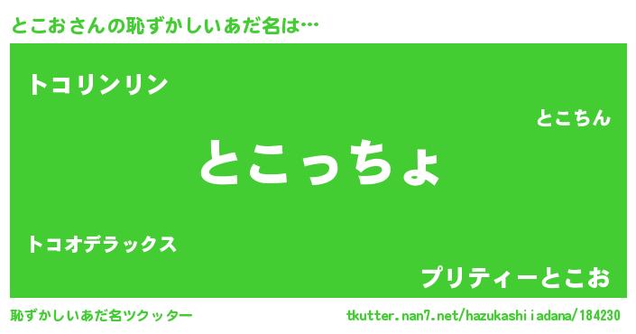| 男性向けラノベタイトル風あだ名 | 『この素晴らしい世界にとこおを!』 |