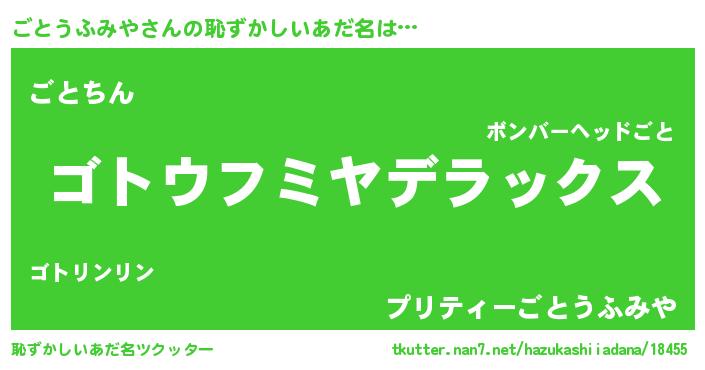 | 男性向けラノベタイトル風あだ名 | 『Re:ごとうふみやから始める異世界生活』 |