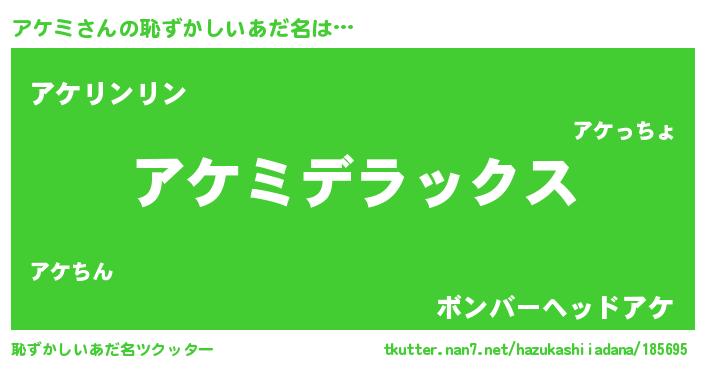 | 男性向けラノベタイトル風あだ名 | 『アケミ~年齢イコール彼女いない歴の魔法使い~』 |