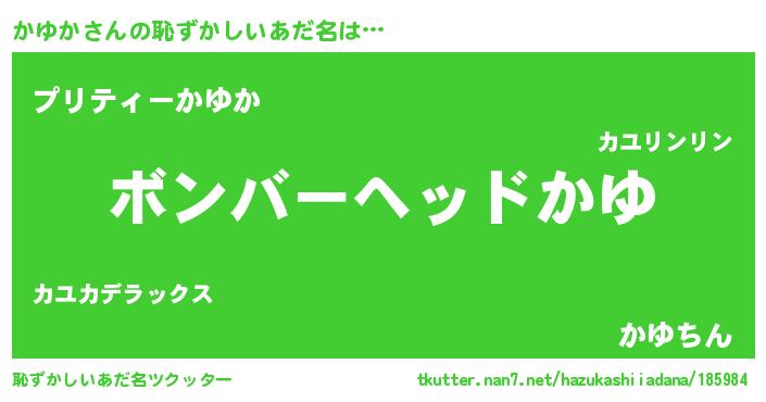 かゆかさんの恥ずかしいあだ名は… 『ボンバーヘッドかゆ』『プリティーかゆか』『かゆちん』 ツクッター #恥ずかしいあだ名ツクッター http://tkutter.nan7.net/hazukashiiadana/185984/