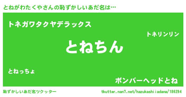 | ヘコむあだ名 | 『とねがわたくや(爆)』『とね太郎』 |