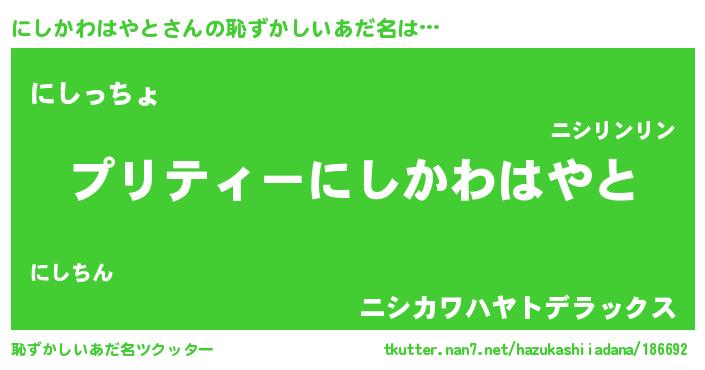 | 男性向けラノベタイトル風あだ名 | 『この素晴らしい世界ににしかわはやとを!』 |