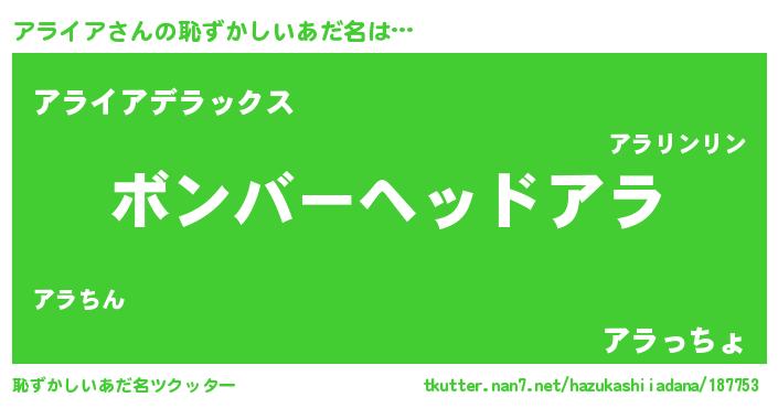 | 男性向けラノベタイトル風あだ名 | 『転生したらアライアだった件』 |