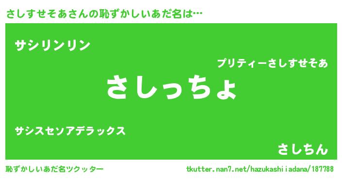 | 男性向けラノベタイトル風あだ名 | 『さしすせそあ~年齢イコール彼女いない歴の魔法使い~』 |