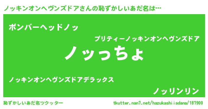 | 男性向けラノベタイトル風あだ名 | 『ノッキンオンヘヴンズドアスレイヤー』 |