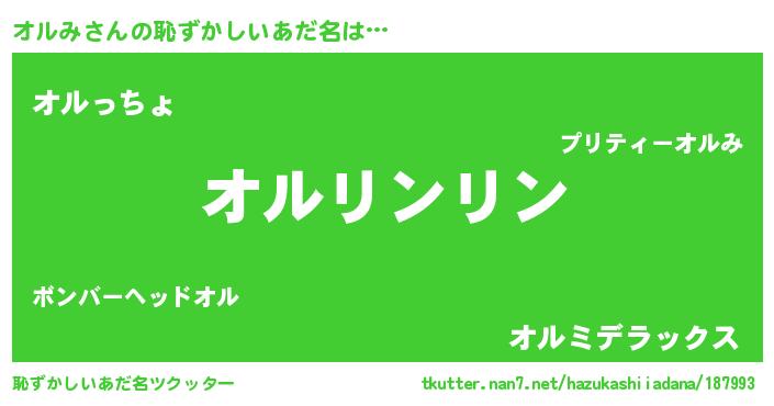 | 男性向けラノベタイトル風あだ名 | 『この素晴らしい世界にオルみを!』 |